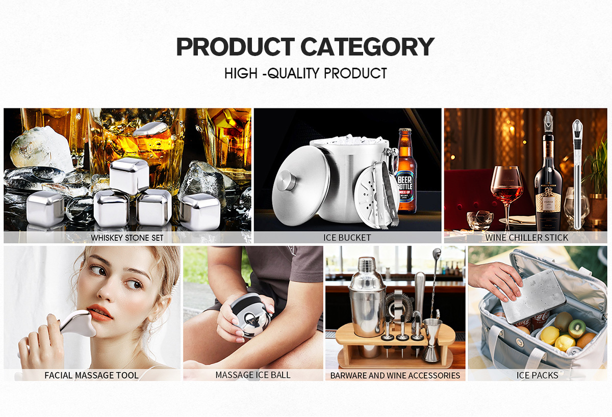 मुख्य उत्पादों: स्टेनलेस स्टील व्हिस्की पत्थर, क्रेयो स्टिक, आइस ग्लोब्स, आइस रोलर, वाइन चिलर स्टिक